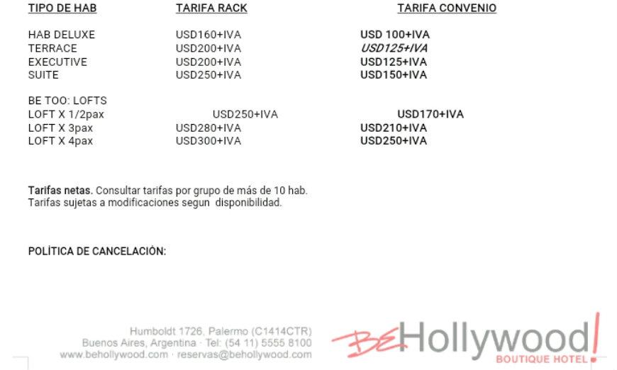 Aquellos interesados en reservar habitaciones del hotel, ubicado en Humboldt 1726 barrio Palermo Hollywood, lo pueden hacer al teléfono 5555-8100 o al correo reservas@behollywood.com