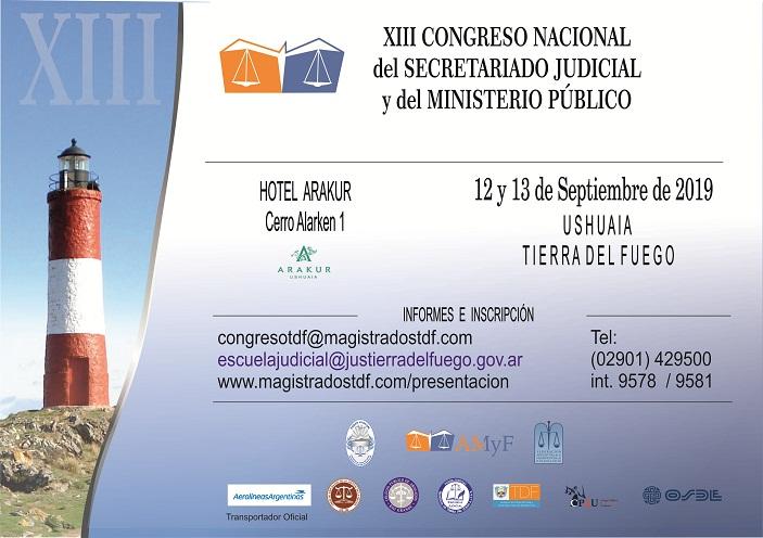 El “XIII Congreso Nacional del Secretariado Judicial y del Ministerio Público” organizado por la Federación Argentina de la Magistratura y la Función Judicial y por la Asociación de Magistrados y Funcionarios de la Provincia de Tierra del Fuego, Antártida e Islas del Atlántico Sur y el Poder Judicial de Tierra del Fuego, sesionará en la ciudad de Ushuaia los días 12 y 13 de septiembre en sede del Hotel Arakur, sito en Cerro Alarken 1.