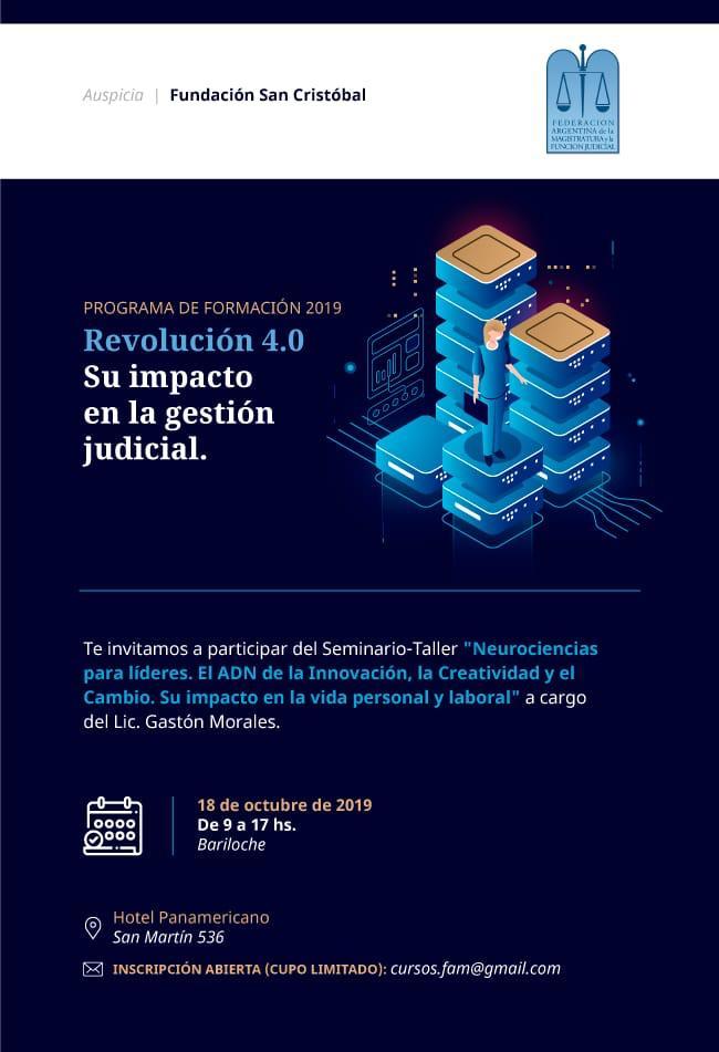El próximo 18 de octubre en la ciudad de Bariloche se llevará a cabo el tercer Encuentro de Formación Revolución 4.0-su impacto en la gestión judicial con el “Taller de Neurociencias para líderes. El ADN de la Innovación, la Creatividad y el Cambio. Su impacto en la vida personal y labora”.