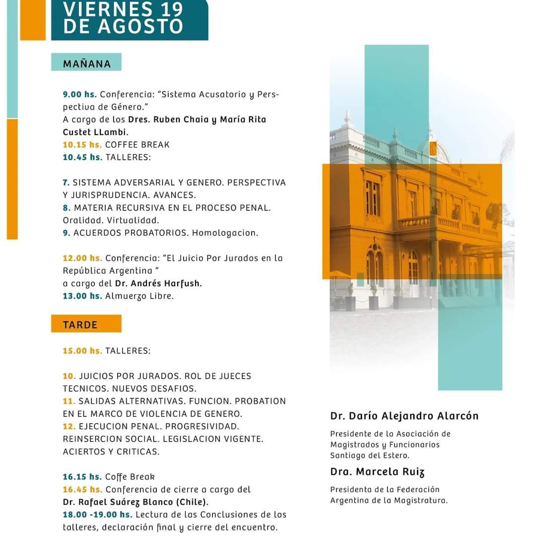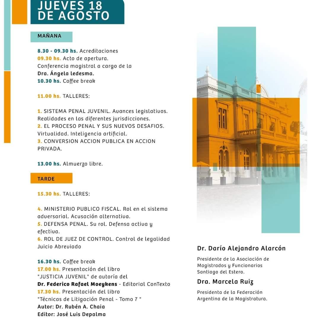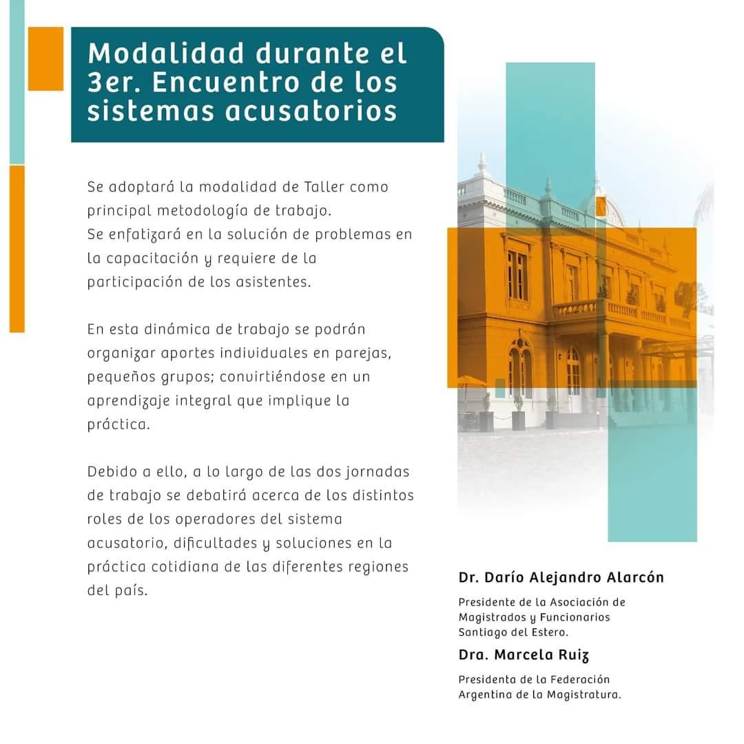“Se espera una importante respuesta de las asociaciones del país que estarán presentes con sus representantes, como así los magistrados y funcionarios de la Justicia penal que están interesados en profundizar experiencias y contextos sobre este nuevo sistema que, en el caso de Santiago del Estero, ya se encuentra implementado”, comentó Darío Alarcón, presidente de la Asociación.