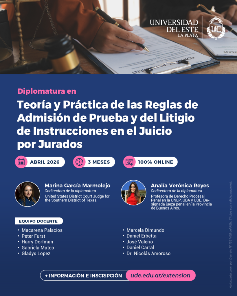 Se encuentra abierta la inscrpción a la Diplomatura sobre Teoría y Práctica de las Reglas de Admisión de Prueba y del Litigio de Instrucciones en el Juicio por Jurados organizada por el Programa de Extensión sobre Juicio por Jurados y Litigación de la Universidad del Este, con descuentos especiales para integrantes de la FAM.